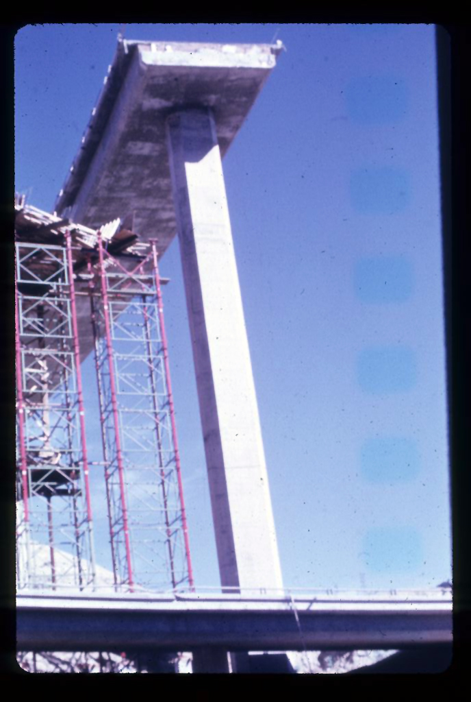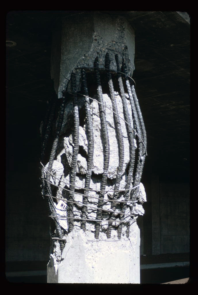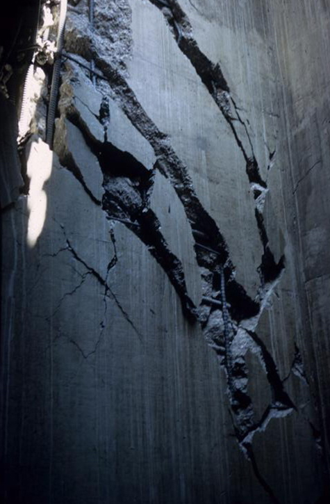 It is the water filtration plant that really stands out in Loring’s memory, however. While visiting the Jensen Water Filtration Plant, Loring was asked to inspect a damaged water reservoir. Constructed essentially as a rectangle, with the sides below-grade and top level (or ceiling) level with the ground, the facility had sustained heavy damage. During construction, the contractor had piled up to 6 feet of dirt on top of the concrete ceiling to prevent buoyancy (when empty, these types of structures tend to “pop” out of the ground due to lateral and upward forces). After the earthquake, they set up scaffolding inside the reservoir to see what condition it was in. As one of the engineers there to see the facility and document the damage, Loring climbed up the scaffolding to the roof of the reservoir. As he stood on wiggly scaffolding, in the dark, with broken rebar sticking out at odd angles, thousands of pounds of damaged concrete and loose dirt above his head, his knees started shaking when he made an alarming but intriguing observation: the 500-foot-long concrete slab roof had slid back and forth in excess of 2 feet during the earthquake along a construction joint. After making his observation and documenting the conditions, Loring was happy to climb safely out of the water reservoir.
